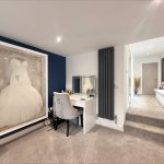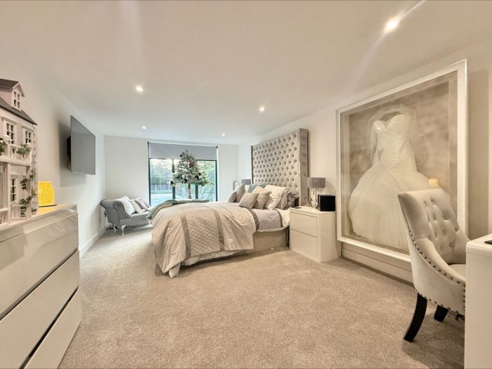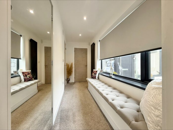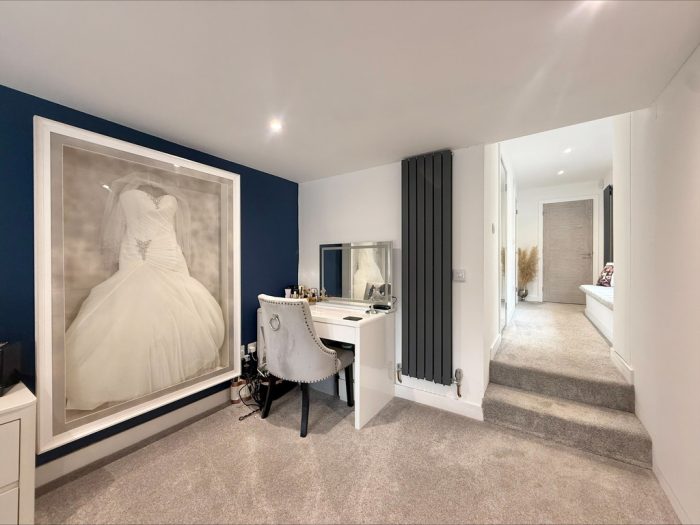 BEDROOM 1 18' max" x 10' 6 max " (NaNm x 3.2m) UPVC double-glazed window to front; dressing area 12'1' x 4'4" with UPVC double-glazed window to side; walk-in wardrobe fitted with a range of shelving and hanging rails.
