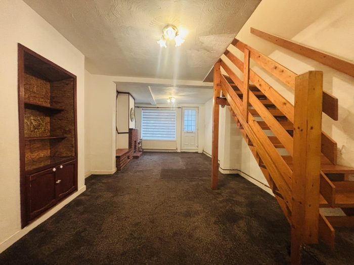 LOUNGE 24' 11" (7.59m UPVC window to front with two radiators; feature fireplace (capped off); exposed staircase.
