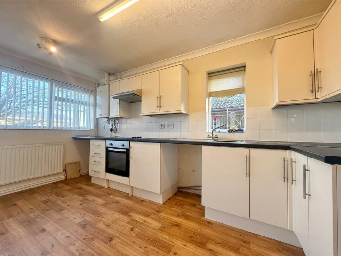 KITCHEN 14' 6" x 9' (4.42m x 2.74m) fitted with a range of wall and base units with square edge work surfaces over; inset stainless steel single drainer sink with mixer tap over; inset electric hob with cooker hood over; built-in electric oven; tiled splashbacks; plumbing for automatic washing machine; space for fridge freezer; wall mounted gas-fired central heating; boiler; UPVC double-glazed window to front and side; built-in storage cupboard.