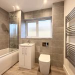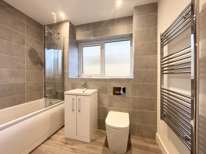 BATHROOM panelled bath with shower over, wc and vanity unit with hand wash basin.