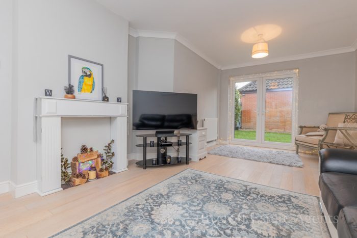 LOUNGE 21' 4 max" x 11' 8 max" (6.5m x 3.56m) UPVC double-glazed window to front; UPVC double-glazed French door to the rear; fireplace (currently covered) TV point; fitted white washed oak flooring.