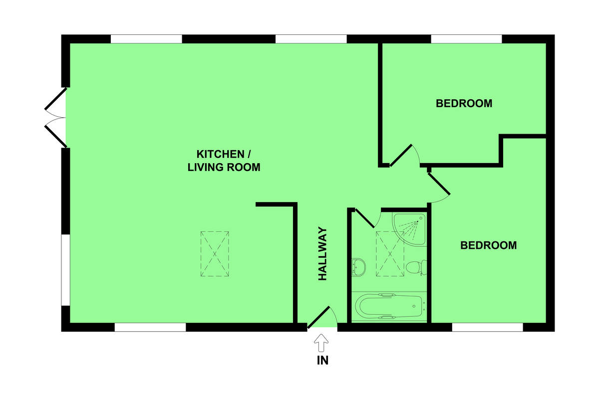 OPEN PLAN KITCHEN DINING LIVING SPACE 21' 9 max" x 21' 8 max" (6.63m x 6.6m) 2 UPVC double-glazed windows to rear; UPVC double-glazed French door to side; UPVC double-glazed window to front and side.