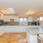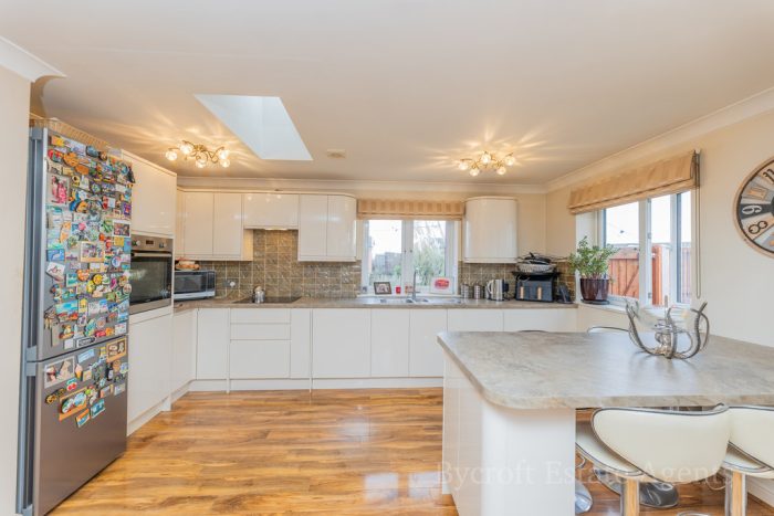 KITCHEN AREA fitted with a range of wall and base units with square edge work surfaces over; inset electric oven and 4 ring electric hob with cooker hood over; inset 1½ bowl sink stainless steel sink with mixer tap over; integrated dishwasher and washing machine; tiled splashbacks; Peninsula breakfast bar; space for fridge freezer and Velux roof light window.