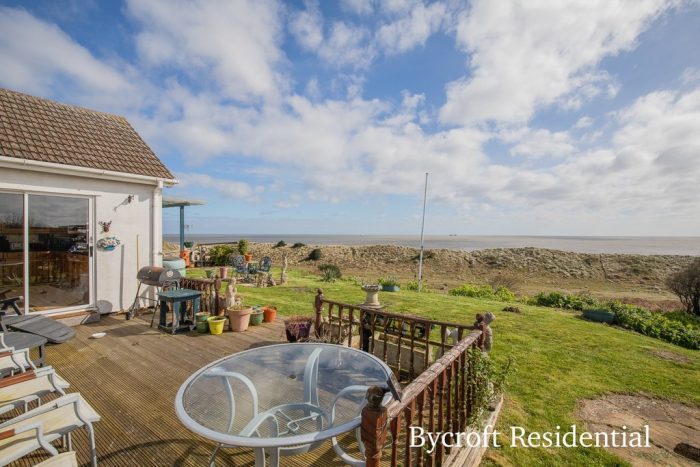 OUTSIDE To the front of the property is a brick weaved drive providing parking for 2/3 cars with access to GARAGE with up and over door. To the rear is a decked area directly off the kitchen and lounge. Lawned area. Side access on both sides. Concrete steps giving access directly to the Dune valley. Beautiful views of the Dunes and sea.