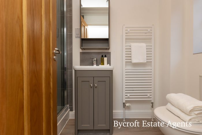 ENSUITE side window; shower cubicle; wc; wash hand basin; heated towel rail.