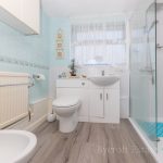 FAMILY BATHROOM 7' 6" x 6' 5" (2.29m x 1.96m) fitted with a white suite comprising of a low level wc, vanity wash basin with mixer tap over and storage cupboards below, bidet, walk-in shower cubicle, shower screen and wall mounted shower unit with hand and soaker attachments; tiled splashbacks; aqua board wall coverings; UPVC double-glazed window to front.