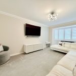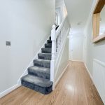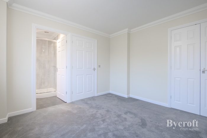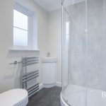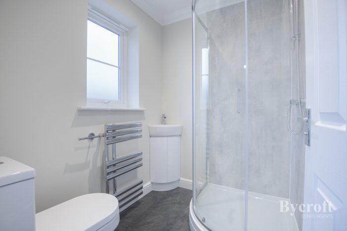 ENSUITE newly installed with wc; corner vanity unit with wash hand basin with mixer tap; shower cubicle; chrome heated towel rail; frosted double-glazed window; down lights.