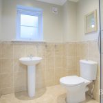 GROUND FLOOR SHOWER ROOM comprising pedestal wash hand basin with mixer tap; wc; shower cubicle with mains shower fittings; tiled floor; frosted double-glazed window; chrome heated towel rail; extractor fan; downlights.