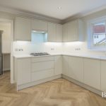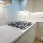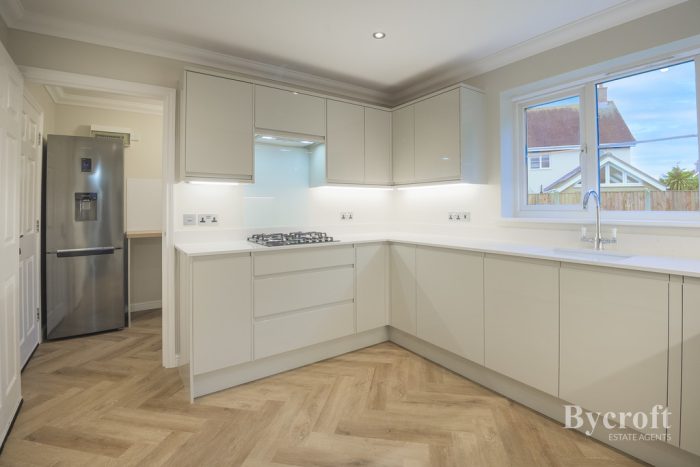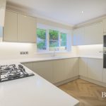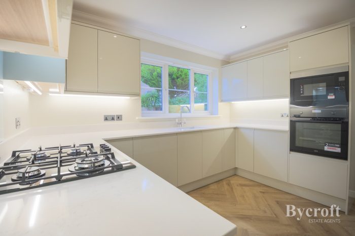 KITCHEN 11' 2" x 10' 3" (3.4m x 3.12m) newly fitted kitchen comprising U-shaped worktop with a good range of base cupboards and drawers under; integrated Bosch dishwasher; built-in eye-level AEG oven and microwave and matching four ring gas hob; recessed one bowl sink with side drainer and mixer tap; range of wall units; concealed light and extractor; window to rear aspect; radiator; downlights; door to:
