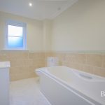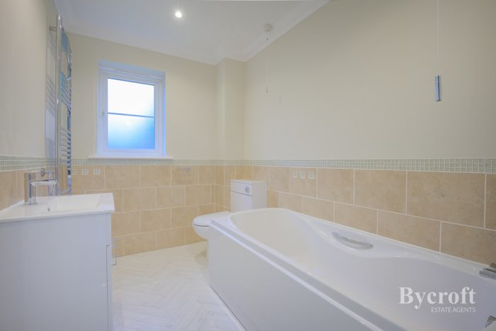 FAMILY BATHROOM bath; wash hand basin; wc; chrome heated towel rail; frosted double-glazed window; downlights.