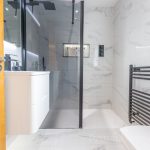 SHOWER ROOM 7' 0" x 6' 0" (2.13m x 1.83m) low level wc; wash hand basin with fixed mirror over; walk in shower with all modern matt black fittings; upvc window to rear aspect; towel rail.