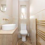 CLOAKROOM wc; vanity unit with wash hand basin and drawers under; towel rail; frosted double glazed window.