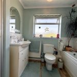 BATHROOM shower cubicle with Mira mains shower fittings; vanity unit comprising wash hand basin with mixer tap and cupboards and drawers under; wc; bath; frosted window; radiator.