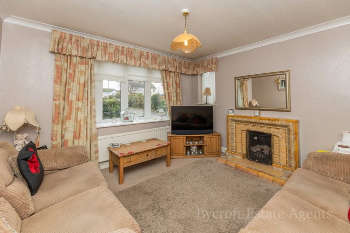 SITTING ROOM 12' 2" x 11' 8" (3.71m x 3.56m) UPVC double-glazed bay window to front; UPVC double-glazed window to side; feature fireplace with inset open fire and decorative tiled surround and hearth.