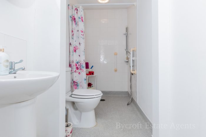 EN-SUITE SHOWER ROOM/ WET ROOM 9' 11" x 4' 3 max" (3.02m x 1.3m) fitted with a white suite comprising of pedestal wash hand basin; low level wc; wall mounted shower unit with tiled splashbacks; UPVC double-glazed window to rear; loft access.