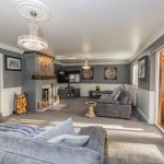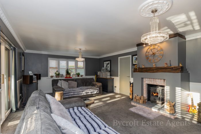 SITTING ROOM 24' 4" x 14' 5 max " (7.42m x 4.39m) UPVC double-glazed window to side; UPVC double-glazed bay window to front; feature fireplace with decorative timber beam; tiled hearth and inset wood burning stove.