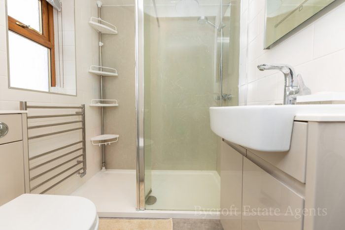 EN-SUITE SHOWER ROOM 6 max' x 5' 3 max " (1.83m x 1.6m) fitted with a white suite comprising of a vanity hand wash basin with mixer tap over and storage cupboards below, low level wc, walk-in shower cubicle with shower screen, wall mounted shower unit with hand and soaker attachment; fully tiled walls; aqua board shower encloser; UPVC double-glazed window to front; heated towel raid radiator.