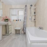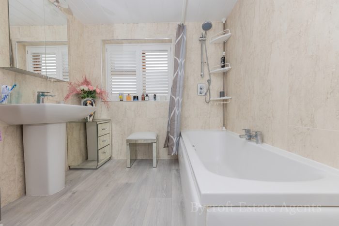 FAMILY BATHROOM 11' 3" x 7' 5 max " (3.43m x 2.26m) fitted with a white suite comprising of pedestal wash hand basin with mixer tap over, low level wc, double ended panel bath with mixer tap over and wall mounted shower unit over; fully tiled walls; built-in airing cupboard; UPVC double-glazed window to side; heated towel rail radiator.