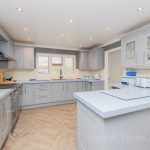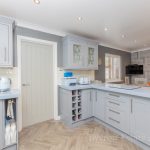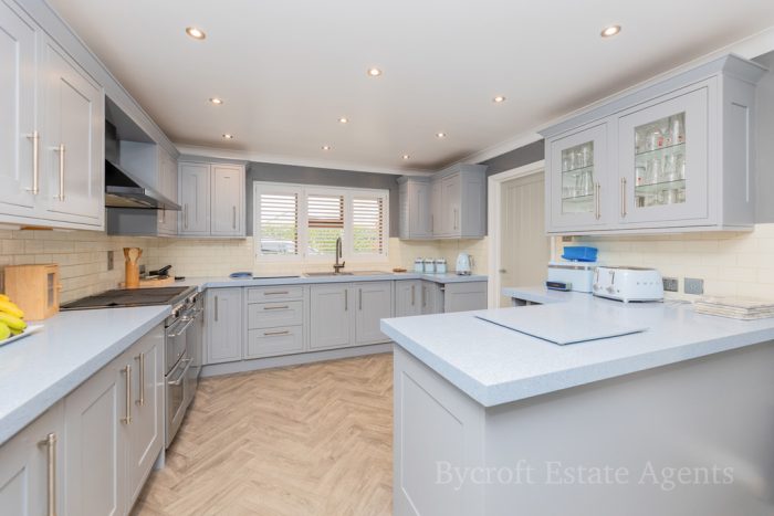 KITCHEN 19' 7" x 11' 5" (5.97m x 3.48m) fitted with a range of wall and base units with square edge quartz work surfaces over; inset 1½ bowl single drainer sink with mixer tap over; electric Range cooker with cooker hood over; tiled splash backs; feature wine rack; glass front display shelving; UPVC double-glazed window to front.