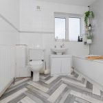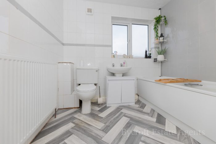 BATHROOM 8' 7 max" x 8 max ' (2.62m x 2.44m) fitted with a white suite comprising of a panel bath with shower mixer tap over; pedestal wash hand basin; low level wc; fully tiled walls; extractor fan; UPVC double-glazed window to front; built-in airing cupboard.