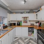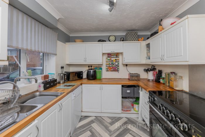 KITCHEN 10' 8" x 8' 6" (3.25m x 2.59m) fitted with a range of wall and base units with solid work surfaces over and tiled splashbacks; space Range cooker with stainless steel splashback; inset 1½ bowl sink stainless sink with mixer tap over; UPVC double-glazed window to front; plumbing for dishwasher.