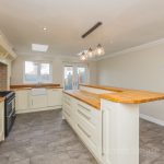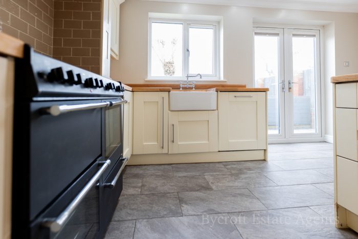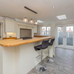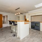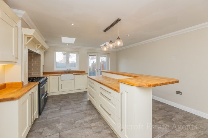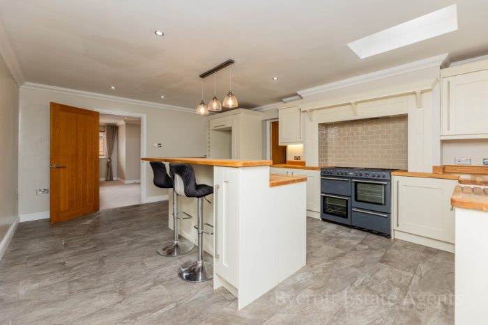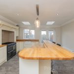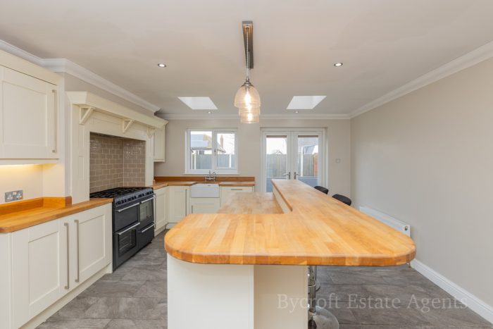 KITCHEN/DINER/FAMILY ROOM 18' 6" x 14' 2" (5.64m x 4.32m) large L-shaped worktop with a range of base cupboards and drawers; including integrated dish washer; Belling range oven with gas hob; butler sink with mixer tap; island/breakfast bar with a range of drawers and cupboards under; wall units; recess providing space for American style fridge freezer with a pull out storage rack to the side; wine fridge and rack; high level storage cupboard; window and French doors to the rear garden; two Velux roof lights; radiator; downlights; tiled flooring; door into: