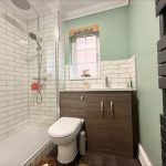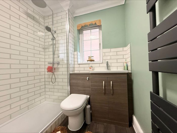 BATHROOM 6' 4 max" x 6' 2 max" (1.93m x 1.88m) fitted with a white suite comprising of a vanity wash hand basin with mixer tap over and storage cupboards below; low level wc; walk-in shower cubicle, shower screen and wall mounted shower unit with hand and soaker attachments; aqua board splash backs; UPVC double-glazed window to side; heated towel rail radiator.