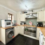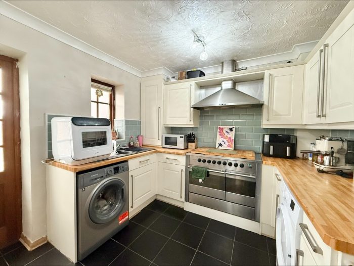 KITCHEN DINER 12' 6 max" x 9' 3 max " (3.81m x 2.82m) fitted with a range of wall and base units with roll edge work surfaces over; inset 1½ bowl sink with mixer tap over; plumbing for automatic washing machine; space for tumble dryer; built-in Range cooker with cooker hood over; tiled splash backs; wall mounted gas-fired central heating boiler; space for American style fridge-freezer. Dining area - window to rear Conservatory; UPVC double-glazed door to rear Conservatory.