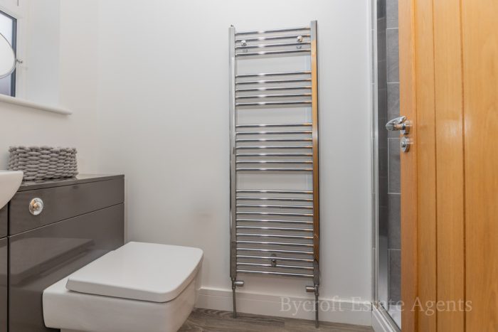 EN-SUITE SHOWER ROOM 7' 10" x 3' 11" (2.39m x 1.19m) fitted with a white suite comprising of a vanity wash hand basin with mixer tap over and storage cupboards below; low level wc; walk-in shower cubicle with sliding shower screen door; wall mounter shower unit with hand and soaker attachments; UPVC double-glazed window to rear; extract fan; heated towel rail radiator.