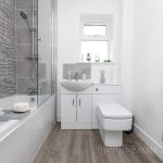 FAMILY BATHROOM 6' 8" x 5' 10" (2.03m x 1.78m) fitted with a white suite comprising of a panel bath with mixer tap over; shower screen and wall mounted shower unit with hand and soaker attachments; vanity wash basin with mixer tap, storage cupboards below; low level wc; tiled splashbacks; extractor fan; UPVC double-glazed window to front; heated towel rail radiator.