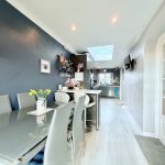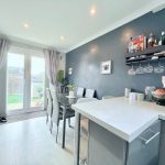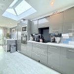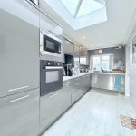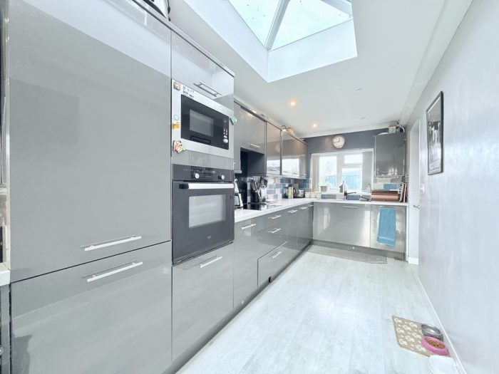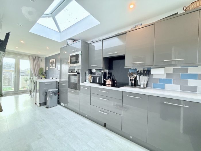 KITCHEN/DINER 25' 3" x 6' 8" (7.7m x 2.03m) large worktop with a range of base cupboards and drawers under; including built in oven with four ring hob; integrated microwave; bowl and half sink with mixer tap; range of wall units; concealed light and extractor; light lantern; window to front aspect; upvc French doors to the rear; down lights; radiator; double doors into: