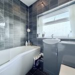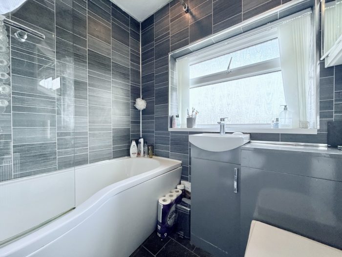 BATHROOM vanity unit comprising wash hand basin with mixer tap; wc with concealed push button cistern; storage cupboard; bath with curved shower screen, mixer tap and shower attachment; frosted double glazed window; radiator.