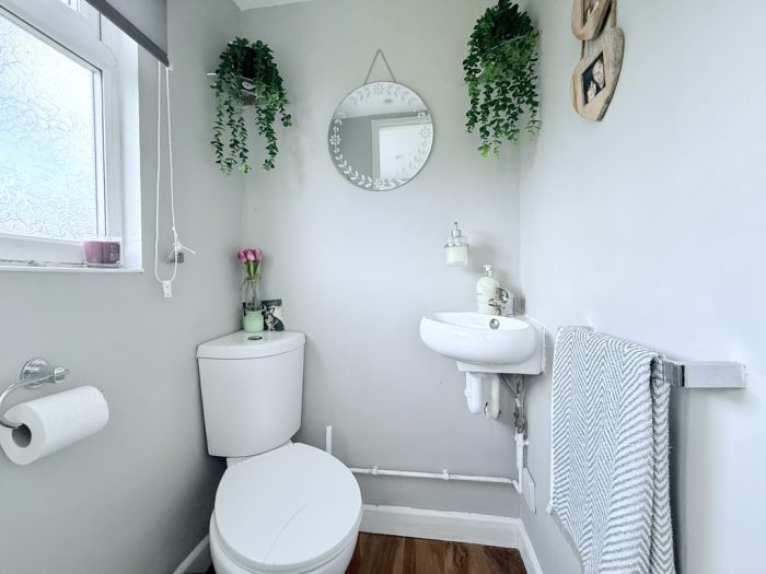 CLOAKROOM corner wc; corner wash hand basin with mixer tap; frosted double glazed window.