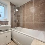 BATHROOM 6' 3 max" x 5' 6 max" (1.91m x 1.68m) a suite comprising of a low level wc, pedestal wash hand basin, panel bath with shower screen and wall mounted shower unit over; tiled splash backs; extractor fan; UPVC double-glazed window to side; heated towel rail radiator.