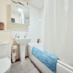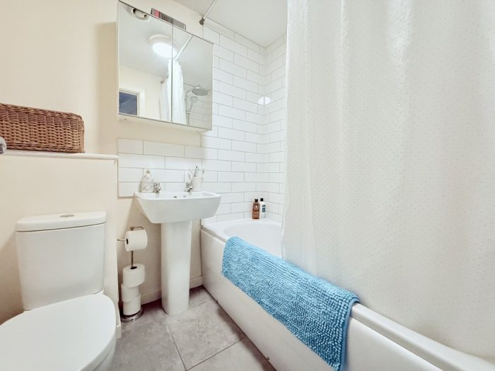 BATHROOM wc; pedestal wash hand basin; bath with mains shower fittings and two shower heads; heated towel rail; extractor fan.