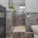 SHOWER ROOM vanity unit comprising wc with concealed push button cistern, wash hand basin with mixer taps, storage drawers under; walk-in shower with mains fittings and two shower heads; frosted double-glazed window; heated towel rail; downlights; extractor fan.