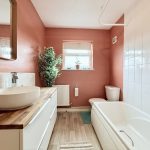 BATHROOM spacious bathroom with vanity unit comprising of circular wash hand basin with mixer tap and storage drawers under; wc; bath with electric electric shower fittings; frosted double-glazed window; radiator; extractor fan; cupboard housing the gas boiler.