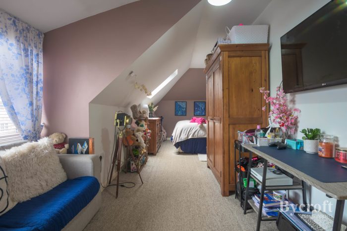 BEDROOM 1 21' 11" x 10' 4 max" (6.68m x 3.15m) part sloping ceiling with Velux window; window to front aspect; two radiators; storage space with hanging rail.