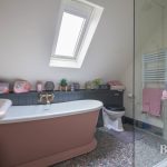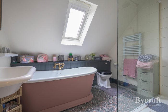 BATHROOM spacious family bathroom comprising of high quality fittings benefitting from unlacquered tapware by Catchpole and Rye, wash hand basin with brass mixer tap; superb free standing bath again with brass mixer tap; large double walk-in shower with mains fittings and two shower heads; wc with concealed push cistern; part sloping ceiling with Velux window; heated towel rail and quality terrazzo flooring.