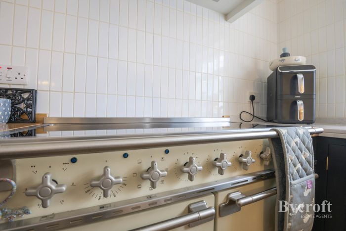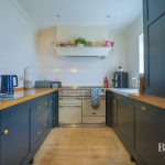 KITCHEN DINER 24' 6" x 12' 1 max incl stairs" (7.47m x 3.68m) stairs to first floor; under stairs storage cupboard; U-shaped Verde butterfly granite worktop; range of base, cupboards and drawers under; integrated Bosch dishwasher, large Range Master cooker; fridge/freezer; one bowl sink; fitted larder cupboard with shelving and storage; Fisher & Paykel Range canopy light and extractor; panelled walls; down lights; windows to rear aspect; radiator; UPVC door leading to garden.