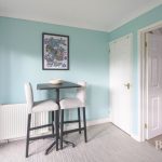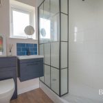 SHOWER ROOM wc with concealed push button cistern; wall hung vanity unit with wash hand basin, matt-black mixer tap; storage cupboard; large walk-in shower with Triton electric shower fittings; matt-black heated towel rail; frosted double-glazed window; extractor fan.