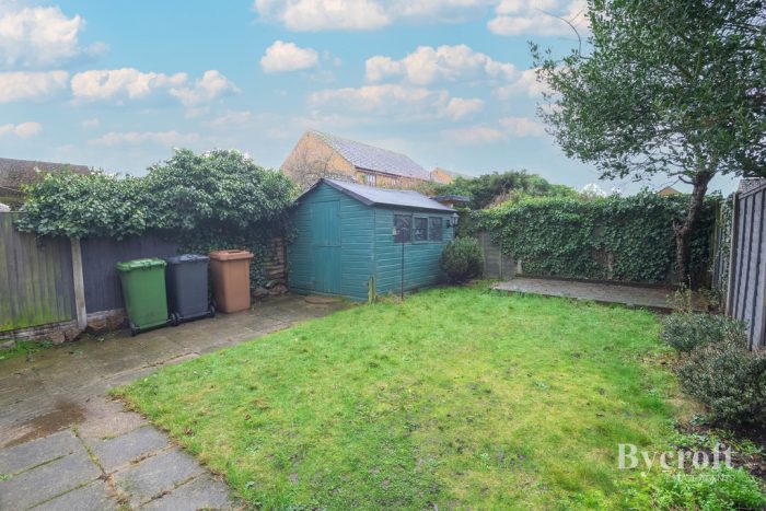 OUTSIDE To the front of the property is a low maintenance garden , pathway to front door. To the rear of the property is an enclosed south facing garden with paved patio, lawn and further raised decked patio, timber storage shed. Side driveway with place for two cars standing.