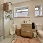 SHOWER ROOM walk in shower cubicle with mains fittings; vanity unit with wash hand basin, mixer tap and storage drawers under; wc; chrome heated towel rail; two frosted windows; extractor fan.