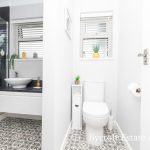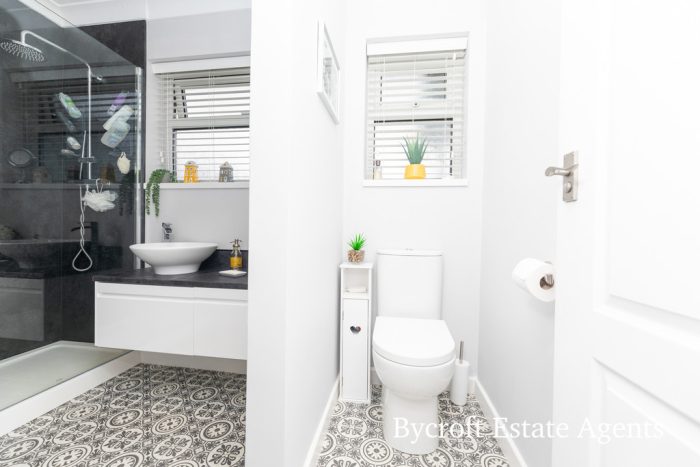 SHOWER ROOM spacious shower room with large shower cubicle with mains shower with two soakers; vanity unit with storage cupboard under; circular wash hand basin with chrome mixer tap; frosted double glazed window; down lights; white heated towel rail; wc; push button cistern; further frosted double glazed window.
