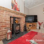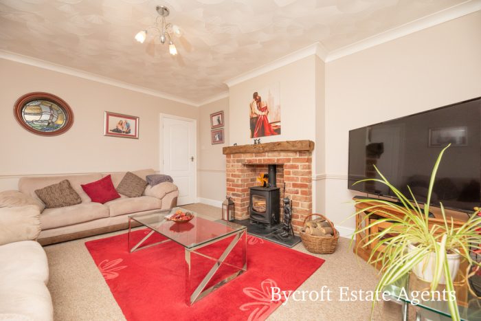LOUNGE 14' 11" x 12' 10" (4.55m x 3.91m) feature cast iron wood burner and brick fireplace; windows to front and side aspects; radiator.