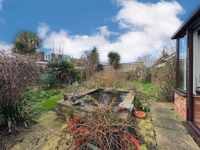 OUTSIDE To the rear a garden area with mature trees and bushes, lawn area, paved area with fish pond, access to the garage