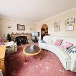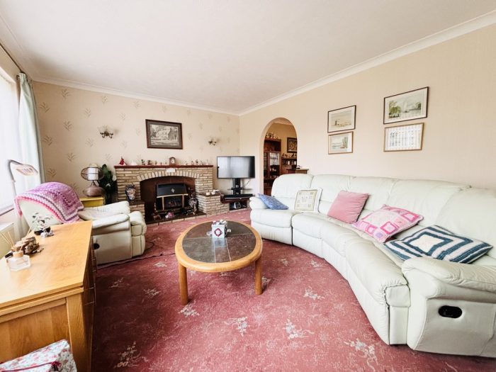 LIVING ROOM 18' x 13' (5.49m x 3.96m) large UPVC double-glazed window to the front; radiator; brick fireplace. Archway to;