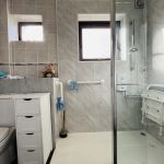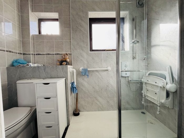 DOWNSTAIRS SHOWER ROOM 8' x 5' (2.44m x 1.52m) walk-in electric shower; wash basin; wc; two UPVC double-glazed windows; towel rail radiator.