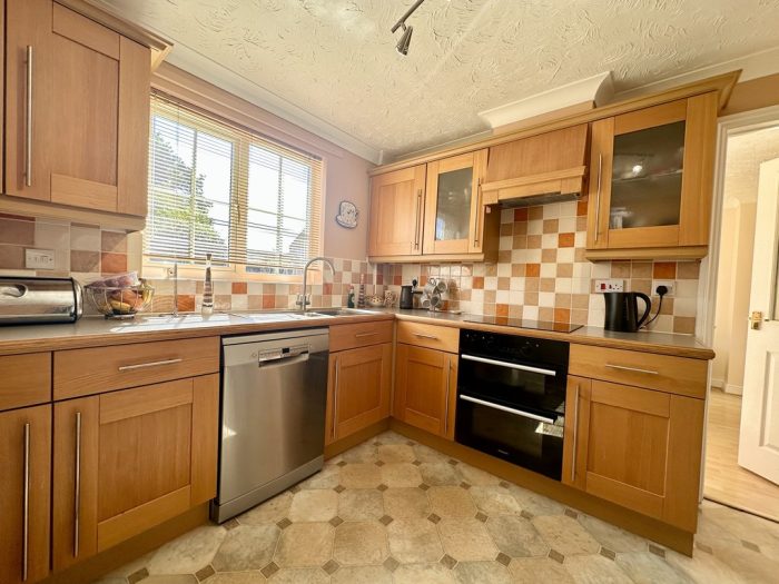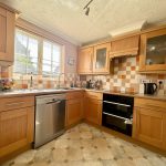 KITCHEN 9' 3" x 10' 2" (2.82m x 3.1m) large l-shaped worktop with a range of base cupboards and drawers; built in Hotpoint oven and grill; space and plumbing for dishwasher; bowl and a half sink with mixer tap; four ring Zanussi hob; further worktop with cupboard and drawer under; space for upright fridge freezer; range of wall units including canopied light and extractor; radiator; window to rear aspect; door to Utility.
