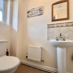 CLOAKROOM wc; pedestal wash hand basin; frosted window; radiator.